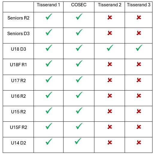 Seniors Ligue : R1 (T3 PN - T4 SY) / R2-R3 (T5 PN ou SY)Seniors District : D1-D2 (T5 PN ou SY) / D3-D4 (T6 PN ou SY)